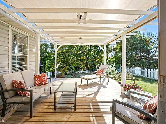 What a dollhouse! Lovingly cared for by original owners and move in ready! Great floorplan! 3 bedrooms, 2 full baths, plus a large loft area overlooking the family room, makeing the perfect space for a rec rm/play rm or possible 4th bed! Welcoming foyer entrance, vaulted family rm w/firepace, sunroom, formal dining area, cheerful white kitchen w/tile floor, decorative tile backsplash & pantry. Laminate hardwood and tile in all living areas, baths and kitchen! Split bedroom plan, owner's suite w/trey ceiling, walk-in closet, soaking tub & updated tile shower. Private hall to secondary bedrooms & bath. Great outdoor space w/french doors to big deck w/pergola & sunshade ceiling fans, grilling area, firepit area & picket fenced backyard. Mature landscaping!