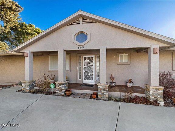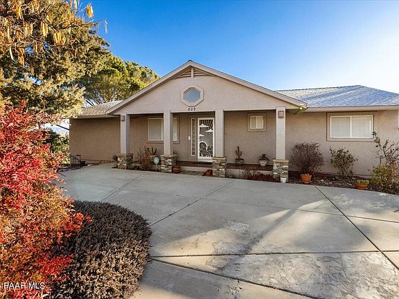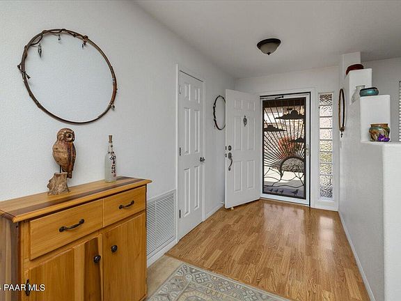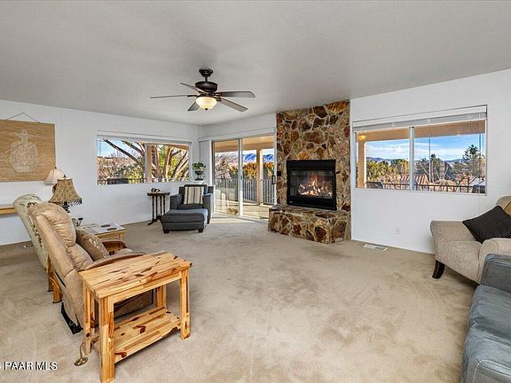Step into this meticulously cared-for residence, an oasis of comfort in the sought-after Prescott Country Club. From the moment you arrive, the remarkable curb appeal and mature landscaping beckons you to explore this property. Panoramic views of the Mingus and Bradshaw mountain ranges, coupled with scenic vistas of the golf course within the community, create a breathtaking backdrop. As you step inside this main level living home, you're greeted by a spacious living room adorned with expansive windows that frame stunning views and a beautiful floor-to-ceiling stone gas fireplace, setting a tone of warmth and sophistication. A stair-stepped wall seamlessly divides the living room from the formal dining area, flowing into the kitchen with gleaming granite counters, sleek white