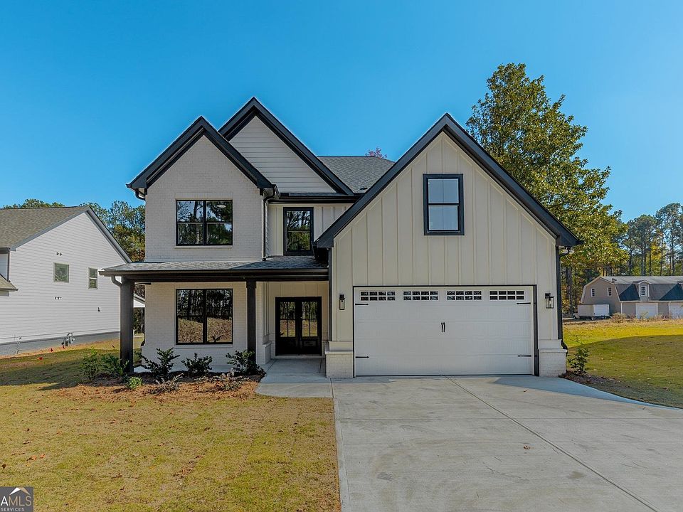 New modern farmhouse style home in Sugar Hill! Covered front porch and welcoming entry. Private dining room and a large open family room featuring a custom tile fireplace, shiplap and a coffered ceiling. Stainless steel gas cooktop, vent hood and microwave/oven combo. Walk-in pantry, quartz countertops, built-in desk and a breakfast area with custom-made bench seating. One bedroom and full bathroom on the main floor, perfect for an in-law suite, home office or playroom. The upper level hosts a huge media room/loft with canned lights. Three additional bedrooms and one full bath. The master retreat features a tray ceiling, frameless shower, soaking tub and double vanity. Massive walk-in closet and laundry room access off the master and hall. Covered cozy back porch with fan overlooking the private backyard. Lot is approved for a pool. No HOA and located in the sought after Gwinnett County School district.