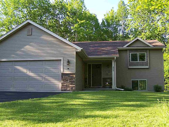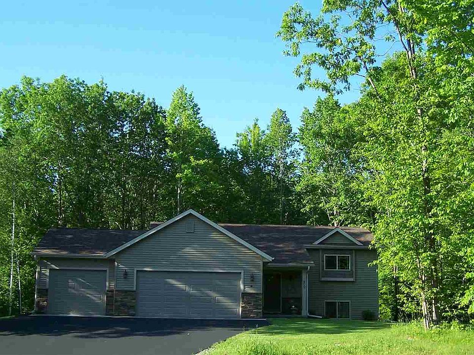 This 3 year old home is in showcase condition as adults only pampered it. Located off I-39/Maple Ridge Rd, nestled in a single loop housing area close to Indianhead Golf Course. Nature, hiking and biking are right outside your door. Home is situated on a .575 acre lot with fully wooded back yard. Raised ranch is maintenance free including energy star vinyl windows, insulation well above standard R-values, high efficiency Rheem furnace and air conditioning, high efficiency electric water heater, quiet vent.Open concept floor plan includes cathedral and tray ceilings, solid oak custom cabinetry, 6-panel Oak doors, hardwood flooring, tile, plush carpet, custom window treatments along with custom detail real wood trim work. Also included is a 12x14 deck, landscaping totally surrounding home, concrete garage apron & sidewalk, oversized 3 car garage, asphalt driveway, and covered front porch. Lower level family room showcases Natural tone tongue & grooved-end matched wood paneling throughout along with extra trim accents for more appeal. Beautiful cabinetry with wet bar accents this awesome room. Utility/laundry room has additional room for all your storage needs. This home is quality through-out!