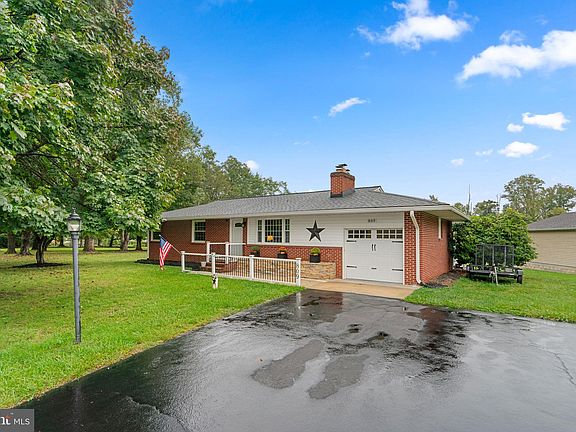 This charming rancher residence offers a range of desirable upgrades and boasts 2,592 total square feet, 3 bedrooms, 1 full bath, 1 half bath, and a 1-car garage on over half an acre in the peaceful Wilna Village. A large driveway offering parking for four cars welcomes you into the stylish interior, showcasing recent modern finishes including refinished hardwood floors throughout the open-concept main level. Upon entering, you'll find a spacious formal living and dining room, highlighted by a warm pellet stove with a mantel, built-in shelving, and convenient garage access. The eat-in kitchen features ample cabinetry, an electric cooktop, and deck access. Rustic barn doors open to the versatile first bedroom which can also be perfect for a private office or study. Continuing on the main level for convenient single-level living is a newly renovated full bathroom with dual vanities and 2 more bedrooms including the spacious primary bedroom with barn doors opening to a large closet. The newly renovated expansive lower level impresses with a large open space, perfect for a family room, and includes a newly updated powder room. Additionally, a versatile bonus room with laundry facilities and ample storage space completes this level. Enjoy alfresco dining on the Trex® deck, which overlooks a spacious, flat backyard featuring a 12’x16’ shed equipped with electricity, all complemented by serene wooded views. Recent updates include an architectural roof, a newer HVAC system, a well pump and tank, a water heater, and updated gutters. Wilna Village is conveniently located near I-95, providing easy access to local shopping centers, dining options, and recreational activities.