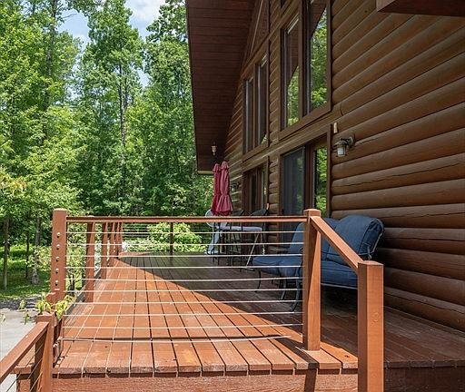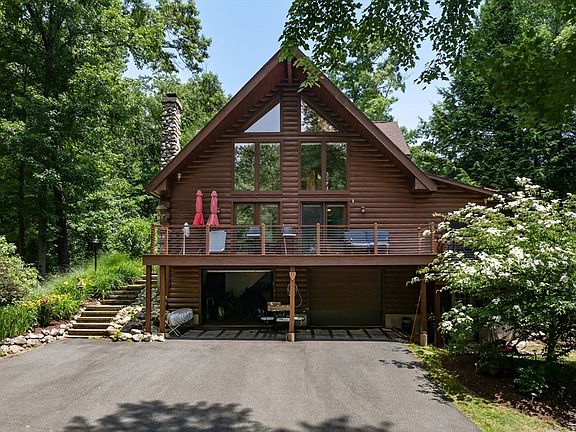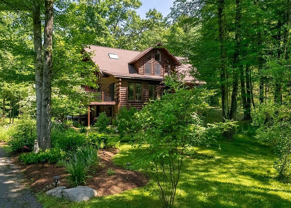 Space and grace fill this architecturally significant log home. Well maintained exterior and totally sheet rocked and insulated on the interior. Peacefully located at the dead end of a winding road yet 10 minutes to both downtown Northampton and Easthampton. The first floor has a grand living/dining room with vaulted ceilings and stunning stone fireplace and skylight. Glass doors open to a huge deck over looking mature perennial gardens, woods and a double lot with potential to build a second dwelling or just enjoy the land. The kitchen is fully applianced with copious cabinets and island. There are two generous sized first floor bedrooms, full bath and beautiful heated sun room. The second floor has a spacious bedroom and 4 piece bath w/ steam shower and Jacuzzi. This bedroom has its own deck and french doors that open to a balcony over looking the living room. Plenty of dry basement storage with Buderus boiler & 2+ garage bays. Tastefully appointed and ready for your enjoyment!