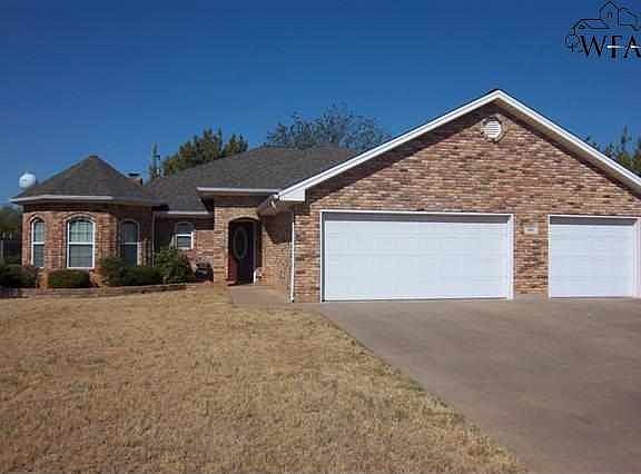 Well maintained brick home in Lakeside City just 7 minutes away from Wichita Falls. Nice kitchen with Corian countertops, convenient dining area. Beautiful corner wood-burning fireplace, laminate & carpeted office/exercise room leads out to open backyard near the park. Master has laminate flooring, his/her closets, deep garden tub. The 3 car garage which enters into the spacious utility room, half bath for quick clean-up from outside work.