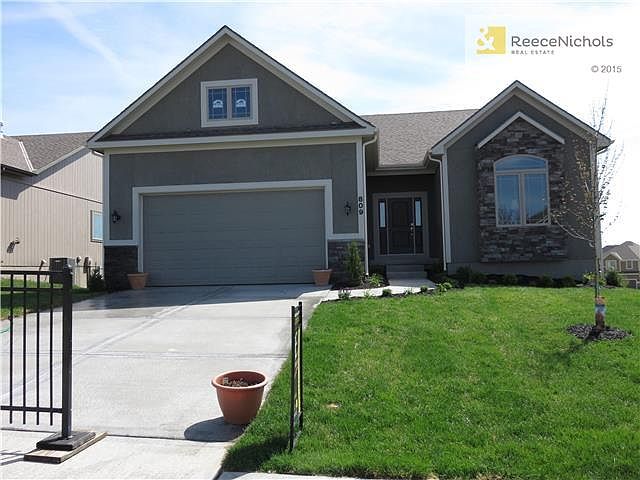 Lovely Reverse 1.5 story Linden plan from award-winning Richard Mather Builders. Open and spacious, featuring bright spaces, large kitchen island and walk-in pantry; 3-head shower in owner's suite. Two bedrooms and two bathrooms on the main level, and the lower level includes large family room and two more bedrooms, along with two storage areas. Wonderful friendly neighborhood, near the City of Raymore Recreation Park. Come see today! Interior pictures are from a previous model.
