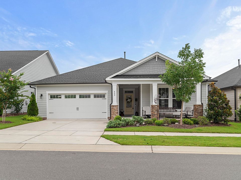 Welcome home to low-maintenance living in the sought-after Encore 55+ section of Wendell Falls! Built in 2022, the Edgemont floorplan offers 3 bedrooms, 2.5 baths, and a study—all thoughtfully designed on one level. The open layout features a spacious living room with a cozy gas fireplace, a bright dining area, and a modern chef's kitchen complete with quartz countertops, upgraded stainless steel appliances, upgrades galore, and a large center island perfect for gathering. The owner's retreat boasts a tray ceiling, expansive walk-in closet, and a spa-like zero entry shower! Step outside to a true showstopper—your own 3-seasons room and an outdoor entertainment patio featuring brick pavers, wall seating, and built-in lighting. Whether it's morning coffee or evening get-togethers, this space is designed to enjoy year-round. Additional highlights include laminate plank flooring throughout the main living spaces, a convenient drop zone entry from the two-car garage, and thoughtful upgrades throughout. Encore residents enjoy exclusive amenities—clubhouse, pool, pickleball, tennis, firepit seating, and a full calendar of social events—plus access to all of Wendell Falls' resort-style offerings. With lawn care included in the HOA, you'll spend more time enjoying life and less time on maintenance.