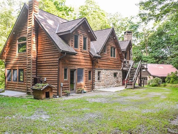 Enjoy the Laurel Highlands in this remodeled contemporary home. Built by local craftsmen, just off Seven Springs Resort with easy 4 season access. Stroll the foot bridge over Allen Creek in front and view the private trout pond in back. Lush native trees, wildflowers and fresh water springs provide pristine, USGS certified no need for treatment/filtration. Enjoy endless, excellent drinking water. Stone fireplace, cast iron wood stove, custom kitchen, lodge furnishings and game table create a perfect retreat. 1st floor guest bedroom, upstairs are 2 big bedrooms and a large master suite with Jacuzzi tub and huge closet. Includes whole house sound system, access to cable/security system. 2 detached garages accommodate 3 vehicles. One has spacious attic with private entry for bedroom/storage. The other has a large pantry w/refrigerators and storage. Upper level heated and air-conditioned game room has pool table, shuffleboard, TV & music providing entertainment for the whole family,