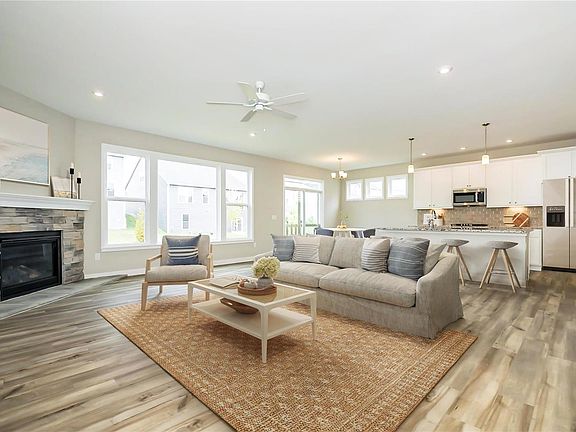 New Construction in The Streets of Caledonia, the Calvin Western Craftsman offers a welcoming covered front porch, an open floor plan that features a family room with a fireplace, and a private study with double doors. Open kitchen with granite counters, 42-inch cabinets, walk-in pantry, island w/seating space, and stainless-steel appliances all open to the family room and morning room. Main floor primary bedroom has a spacious walk-in closet and private full bath with both a tub and a shower. Two additional bedrooms share a centrally located hall bath with a double sink vanity, full basement with full bath rough-in and two-car garage.