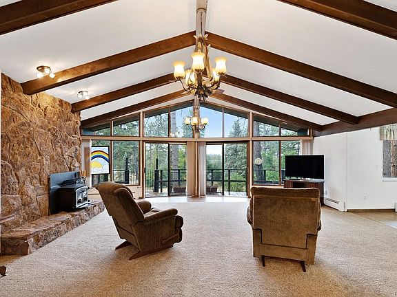 This is a one of a kind Chalet home on a on eof a kind lot with a lot of pine trees. The home has 5 acres with a view of Pikes Peak, open concept, tons of natural light with floor to ceiling windows, 3 beds, 1 full bath, 2 1/2 baths, foyer and mud room entrance from the garage on the main floor. The basement offers 1 bed, 3/4 bath, huge family room and a walk in crawl space for storage. You will not want to go another winter without relaxing by the fireplace and watching the snow fall or relaxing on the deck in the summer time while enjoying all that nature has to offer This home needs two things, you and your final touches to make this the perfect home. Don't miss the opportunity to live in this small town feel community but close to all the necessary amenities of living in the city.