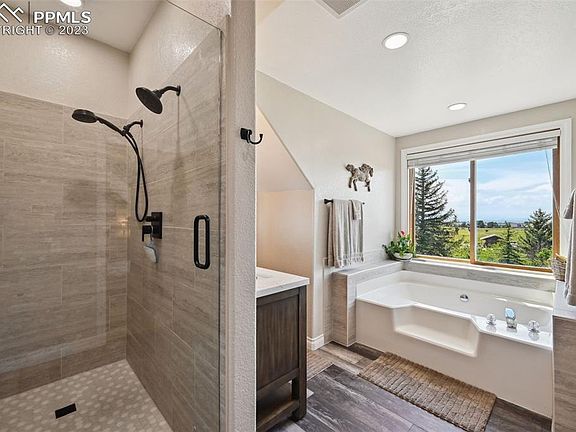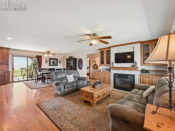 Welcome to this jaw-dropping gem, just a 15-minute hop from Parker! Nestled on 5 acres with breathtaking Pikes Peak views, this beauty will leave you in awe. The main floor features enchanting oak hardwood floors, adding a touch of elegance to every room. Calling all culinary wizards! The kitchen is a dream come true with slab granite countertops, double ovens, cherry cabinets with under-cabinet lighting, and pendant lights over a sizzling 5-burner gas cooktop. All kitchen appliances are included, making it a turnkey culinary haven. Need a cozy corner to conquer work from home? The main floor study offers charm and productivity greatness. The living room invites you to snuggle up by the toasty gas fireplace. The dining room sets the stage for epic gatherings and unforgettable memories. Family and guests will find comfort with two bedrooms sharing a Jack & Jill bath, an extra guest bathroom, and a laundry room. Hold your horses, the master bedroom suite is an oasis of indulgence with a gas fireplace, charming dormers, and a spacious walk-in closet. The master bath flaunts a tub and separate shower for indulgent relaxation. Venture downstairs to the finished basement with a family room and kitchenette for movie nights and late-night snacks. A ¾ bath with a heated tile floor and a fifth bedroom complete the lower level. Extras include a new roof, gutters, furnace, and A/C. Enjoy outdoor shindigs on the deck with a pergola. There are TWO sheds, a chicken coop, dog run, and an oversized detached RV garage with a 14’ door. And guess what? FREE high-speed internet! This home promises a lifestyle of comfort and luxury. A stunning location, top-notch amenities, and thoughtful upgrades in one sweet package. Don't miss this chance to make it yours!