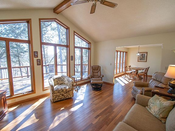 Eagles, Barges, Boats and Wildlife - Your Mississippi River Home is here with Million Dollar Views! You'll love the spacious living and dining area, with a wall of windows for breathtaking views and beautiful hardwood floors throughout most of the main Level. The Living Room has a stone gas fireplace and vaulted ceiling. The lower level family room has a brick fireplace and same fantastic views. You'll enjoy the newer custom 2-level deck with access to the yard and firepits. There is a ladder leading to the Rock Ledge of the river, since the lot is elevated above flood levels. For your safety, do not take the ladder to the ledge. The attached 2-car garage has a lower level (23x23') with it's own driveway and single car garage door. Home is in a secluded neighborhood on large landscaped .48 acre lot. Additional home features include a new roof in 2021, new AC 4/2023, and sauna. See the "Supplements" Section of this Listing for additional home, lot & neighborhood features.