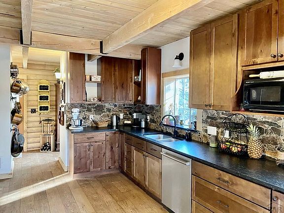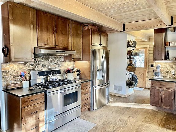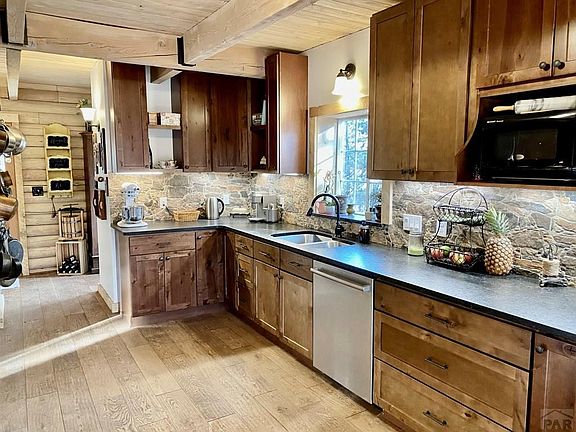 Rustic elegance perfectly describes this rare but stunning log home located on nearly 3 wooded acres at the foot of the Greenhorn Mountain! Rye truly is a hidden gem located only 35 min. from Pueblo, 15 min. from Lake Isabel and 7 min. from Lake Beckwith. Construction on this unique home began in 1992 but was abandoned after the foundation was poured and the logs erected. In 2019 it was purchased and construction completed in 2020. Thus, in many ways, this is a new home with all new plumbing, new electrical, new HVAC including central air, new septic, new roof, new hot water heater, new cistern, and all new interior finishes. A well feeds a cistern which in turn provides water for the home. Knotty maple cabinets with soft close doors, leathered granite countertops and a beautiful stone backsplash make this kitchen a show stopper. A 40" Kenmore Elite gas stove has two electric ovens and gas burners for ultimate performance. Other features include wide plank European Oak flooring with premium, cutting edge hardwax oil finish, expansive decks, and exposed beams. The exterior walls in the full walkout basement have been framed with 2x6's and are ready for sheetrock making it easy and relatively inexpensive to finish. A gas supply line is present in the master bedroom for the addition of a fireplace. Finally, the home is located within school district 70. The elementary and high schools are only 1 mile away and the middle school is only a 15 minute drive.