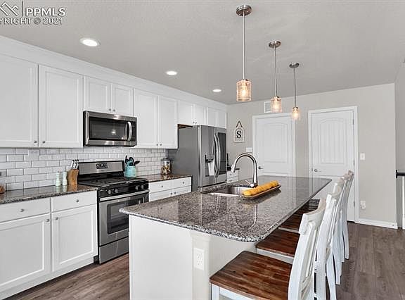 Why wait to build when this stunning Keller Vineyard Rancher shows like a model home and is just waiting for you to move in? A true 3-car finished garage with tall and insulated doors and even a hook up for your electric car! Fully landscaped with vinyl privacy fencing and an extended concrete patio for you to enjoy the beautiful Colorado outdoors! The main level has luxury vinyl wood flooring throughout the hallway, Great Room, Kitchen and Dining Area. The Great Room has recessed lighting, a walk-out to the backyard and a gas fireplace with stacked stone surround. The gourmet kitchen is every chef's dream with a large center island, pendant lighting, granite countertops, subway tile backsplash, tall white cabinetry with crown molding, slow closing drawers, a gas cooktop and beautiful stainless steel appliances including a smart touch screen refrigerator. A large dining space adjacent to the kitchen is surrounded by two walls of windows. The Owner's Retreat has vaulted ceilings and a private en-suite with double vanities with Quartz countertops, an oversized walk-in shower, a private commode area and a walk-in closet! A flex room on the main level is perfect for a home office, study area or formal dining room! There is another bedroom at the front of the home that is adjacent to another full bathroom. Completing the main level is the laundry room with a closet and access to the garage. The finished basement has a huge recreational area to use as you see fit along with two additional bedrooms (one with a walk-in closet) and another full bathroom. The basement is wired for surround sound and has rough-in plumbing for a wet bar. There is also a HUGE unfinished space for storage! Custom window blinds and central air! This one could be on HGTV! Come and fall in love today!