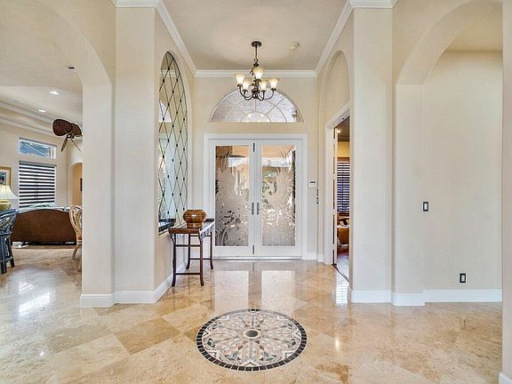 Welcome to this beautiful Mizner Country Club home. Enter the home through the custom etched art glass entry doors to the custom etched arched mirror in the entryway. You are met with a gas fireplace, marble floors in all common areas, rounded corners on all newly painted interior walls, hardwood floors in all bedrooms, guest house and office. The home is decorated with plantation shutters in living room, dining room, office and master bedroom. Ceiling speakers in the living room, family room and pool area. The master bedroom has all built ins in the closets, marble bath and powder room and body jets in the shower. All exterior doors and windows are equipped with accordion hurricane shutters. All of the pavers have been freshly sealed, the pool and spa have dark pebble tek bottom.
