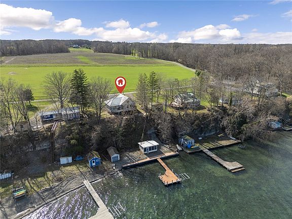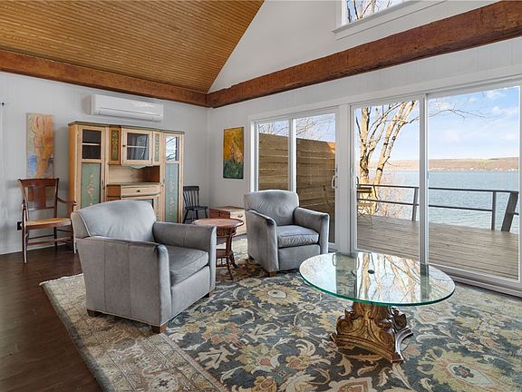 Spacious Cayuga Lake cottage offers a serene lakeside escape with open floor plan, three large main level bedrooms, 2 full baths, and an open upper level loft. Convenient living with essential amenities located on the main level, including a laundry room. Enjoy beautiful summer days with double sliders out to an expansive lakeside deck, relaxing in the lakeview hot tub or cool autumn evenings gathered around the cozy woodstove. Featuring 106 feet of captivating lakefront, this property offers the epitome of waterfront living. Complete with a generous permanent dock, boat lift, boat garage, and screened beach cabana, it provides everything one could desire for a tranquil lakeside lifestyle. Recent updates include roof replacement and a new shore well & water system designed for year round use. Large walkout basement offers plenty of accessible dry storage & workshop space. Check out the virtual tour and call your agent to schedule a showing today. 2 Public open houses Sun 4/21 11:30-1:00 & Sunday 4/28 11:30-1:00.