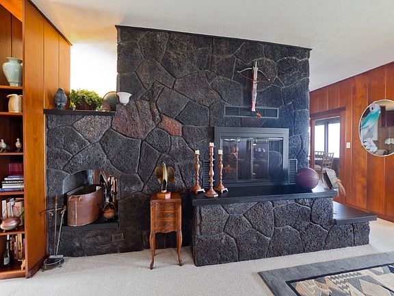 * A lava clad multi sided wood burning fireplace that serves the living room and library.