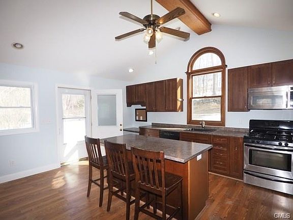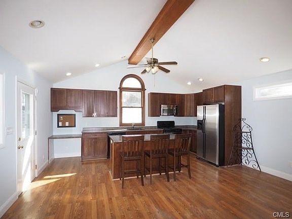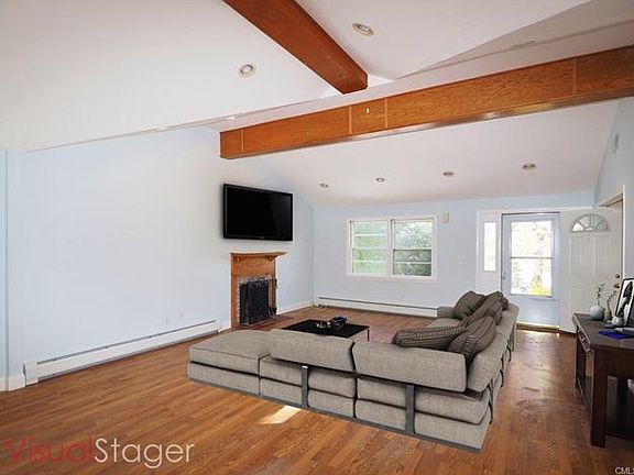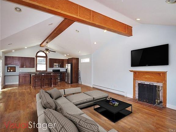 Gorgeous, open 4 bedroom, 3 bath Ranch with vaulted ceilings and beams. Property features and open living room and updated kitchen with high ceilings, and fireplace. Bright dining room with sliders to private back deck, perfect for entertaining. Master bedroom suite with private bath and a walk in closet along with 3 additional bedrooms with ample closet space. Finished lower level play room and full bath. Tons of storage and hardwood floors throughout the main level. Attached 2 car garage provides additional storage. Great location, just minutes from the Merritt!