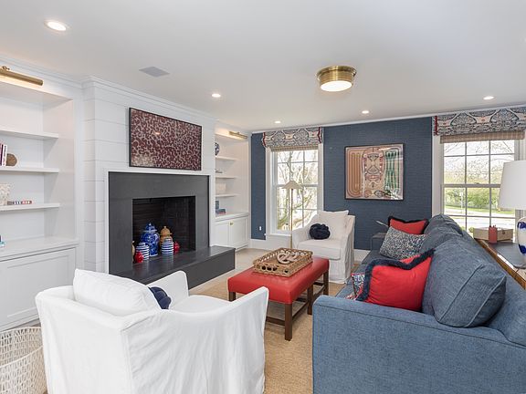 - A, AC, Ins, Irr, OSh, Floor 1: Passing through the beautiful covered front porch on this quintessential Nantucket home, you arrive in the entry hall through the front door flanked on either side by sidelight windows. Through double doors to your right is the cozy den with original wood burning fireplace, complete with oversized window pocket doors to create privacy from the living room. Straight ahead past the stairs to the 2nd level, you enter into the large comfortable living room with large sliding doors and windows and direct access to the deck and pool area. A great wet bar area with amazing lighting, hammered metal sink, and refrigerator and freezer drawers bookends the entrance to the 10 person dining room flanked on both sides by windows; one side looking out to pool and backyard and the other to the front yard. Through the dining room is the great kitchen and family room area with beautiful oversized island and high ceiling with lots of windows and sliding doors out to the pool and deck area. Boasting double SubZero refrigerators, 2 Bosch dishwashers, a 6 burner Wolf range, it also has a separate pantry area with double ovens, appliance pantry and plenty of extra cabinets and storage space. Off the kitchen is the well designed mudroom (the most commonly used entry) with built in seating and special details like outlets at each shelf to setup designated charging stations. A half bathroom is located off the mudroom. On the other end of the first floor, past the main living room is the 1st laundry room and the large first floor bedroom suite with king bed and gorgeous private deck with nice view of the garden. Beautiful fabric wallpaper wraps this room, including the walk-in closet near the entry to the bathroom with double vanity and large walk-in shower. Beautiful hardwood oak floors run throughout the first 2 levels of the house with tasteful shiplap walls, wood shingled roof and copper downspouts. No detail was missed in the design of this incredible home., Floor 2: Ascending the stairway from the front door, which has a custom carpet runner installed, you arrive at the landing for the 2nd floor with 3 ample bedrooms, all en-suite bathrooms with double vanity areas and oversized walk-in showers. The larger principal bedroom on this floor overlooks the pool and has a separate dressing area with great closet space. The bathroom for this bedroom has an extra wide double vanity, a gorgeous oversized soaking tub and an incredible shower space with zero threshold entry, dual shower heads and linear drain.