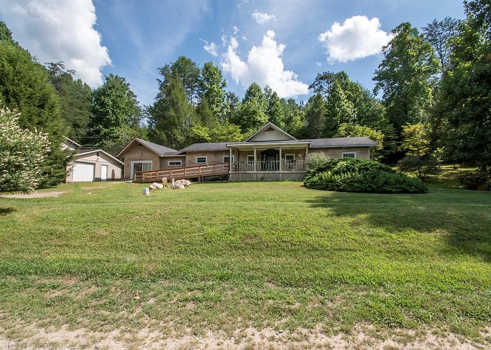 Large 3 BR 3 BA ranch home on approximately 1.5 acres with great long-range views from the front porch & yard & wooded secluded back yard. The killer feature of this home is the eye-catching wood beam cathedral ceiling in the Great Room! You see this amazing feature as you step in the front door & view it across the spacious front living room. Off to the right of teh living room are two bedrooms that have a jack-n-jill bath. On the left another bedroom with en-suite. Off of the Great Room is a formal dining & then the large kitchen. A bonus space that includes a kitchenette, storage & another bath adds all sort of potential as an in-law suite or hobby central. A detached double car garage with doors on both ends & storage above. So much room for a family to live and play together!