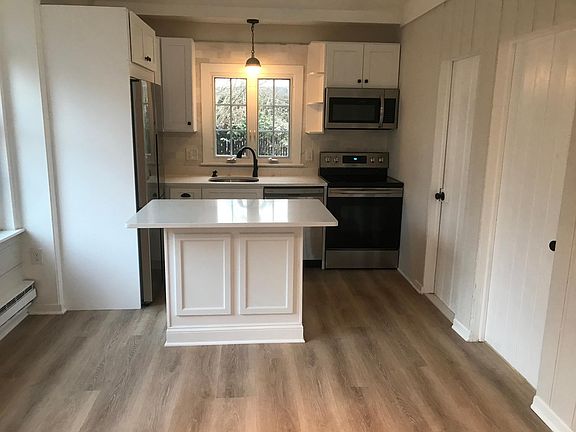 Walk to Long Island sound from this charming remodeled 1 bedroom, 1 bath 475 sq ft. bungalow, located a few blocks from waterfront marinas and restaurants! Cathedral ceilings and skylight make this cute home feel airy and bright. Bedroom has a slider open to your private patio for outdoor relaxation as well as the huge grassy backyard. Open floor plan combination kitchen/living room with white Shaker cabinets, quartz counters, SS appliances incl. DW, and ample-sized island and pullout shelf for easy access. Cozy gas fireplace for those cold winter nights. Wood-look luxury vinyl plank flooring throughout. Bathroom with gorgeous marble-tiled shower. Convenient washer/dryer, electric AC /heat pump, & ceiling fan. Minutes to Clinton Crossing Premium Outlets, beautiful beaches and fabulous restaurants! 20 min to New Haven/ Yale. Minutes to town & train. Situated halfway between Boston and NYC. This could be your year round getaway! Pet on a case by case basis for additional charge of $50/mo.Tenant pays utilities, except cold water, trash removal and snow removal, which landlord supplies. Cable, internet available. Background and credit check required. Non-smoking.