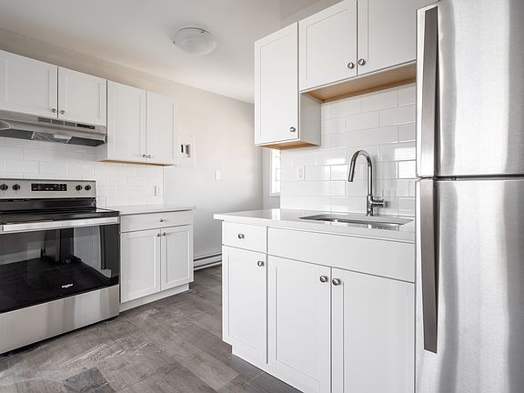 Large windowsSleek white kitchenModern stainless steel appliancesSleek walk-in showerLuxury laminate flooring