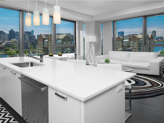 Spacious living room looking out into the newly developed area of Kendall Square. Warm 2 bedroom 2 bathroom in East Cambridge, available now. Walking Distance to Charles River Reservation and Boston Public Garden for seemingly never-ending greenery with walking and biking paths. The living room receives lots of natural lighting from a beautiful window overlooking the bustling city. Modern kitchen with bar seats to host your family and friends as you wine and dine them. Bring your guests to the rooftop or any other amenities for fresh air and fun conversation. Book a tour for the opportunity to see and experience how great of a fit this home is for you. Renter's are responsible for electricity, water, and sewage and billed to the residents in our LEED Certified, energy efficient community; Cable/Internet: Xfinity & Starry. Prices Range from $4,483-$5,283.
