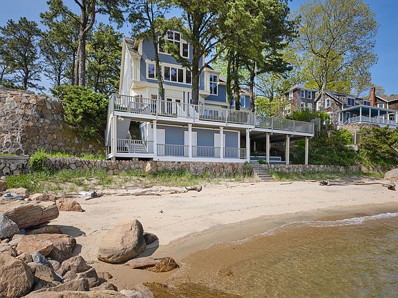This waterfront residence is a striking example of gracious architectural design, exemplary construction, quality finishes & careful maintenance. Perched high above a private, sandy beach in a premier neighborhood, this property is located on one of the best waterfront lots in the area (with over 85' of frontage). Constructed in 1989, it sits on an elevated .32 acre oasis outside of any flood zones. With state-of-the-art fit & finish, this 4 bedroom year-round home is as comfortable as it is elegant. Designed for you to enjoy the surrounding natural beauty, its many windows provide an expansive & bold panorama of the shoreline. Rooms are generously-sized, with plentiful natural light & frequent waterfront views. The LI Sound glistens through a stand of mature evergreens & offers an element of privacy as you take in the breathtaking sunrises & sunsets on the expansive two-tiered waterfront decking. A boater's dream location! Drop your mooring out front & fuel up at a Safe Harbor Marina, only a 1/2 mile away. The lower tier features 3 very rare beachside cabanas with electricity & a shower to wash off the sand & salt. Protected storage for your sunfish, jet skis, kayaks & paddle boards. The deep, stunning beach is the heart of the property & offers a premier waterfront lifestyle with numerous activities that include swimming, beach-combing, fishing, water sports & simply enjoying the sun & surf. Come experience this treasured, tranquil retreat in a setting unlike any other.