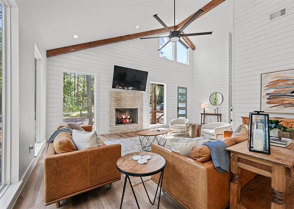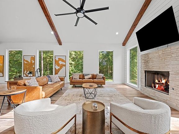 Welcome to your dream getaway, Creekin Aint Easy! This luxury one-story modern cabin blends style, comfort, and nature into the perfect retreat. Professionally curated decor and colors that harmonize perfectly with the cabin's modern design. Step inside and be greeted by soaring ceilings, white lap walls accented with sheetrock and warm wood beams, and a wall of windows that flood the space with natural light and breathtaking wooded views. The entryway showcases a stylish mud wall that provides convenience and character. The open floor plan features a spacious living area with a stone gas fireplace, cozy seating, and smart TVs throughout. The gourmet kitchen boasts quartz countertops, a wine fridge, and high-end finishes—perfect for entertaining. The cabin offers two oversized king bedrooms with beautiful spa like en-suites and a split plan allowing for ultimate privacy. The third bedroom has a double set of twin over queen bunk beds, ideal for hosting family and friends and a full bathroom. There is also a half bath allowing everyone to have their own even guest. Luxurious bathrooms showcase quartz countertops with double vanities, beautiful stylish oversized two-person showers, and modern finishes. Outside, the amenities are endless. The massive covered deck features a ping-pong table, outdoor gas fireplace, dining area, grill, hot tub, and even a slide off the back deck for fun. The property backs to a seasonal large creek, complete with string lights, a fire pit, cornhole, and horseshoes for unforgettable evenings. Nestled on a heavily wooded private feeling lot and circle drive—making this the ultimate retreat or income-producing short-term rental. Under current management guest can enjoy use of a pickleball court! Minutes from Choctaw Landing, wineries, dining, Broken Bow lake and the revamped downtown. Avoid Hochatown lodging tax but close enough to enjoy all it has to offer and retreat back to serenity!