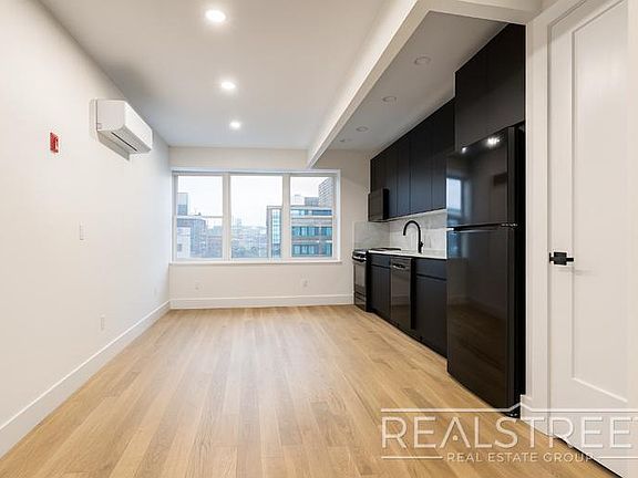 Enter the open concept kitchen and be greeted by a stylish sleek kitchen featuring all black cabinets and appliances including black ss appliances like a dishwasher, microwave and range. Flooded with sunlight through the extra large windows. This is a small studio.