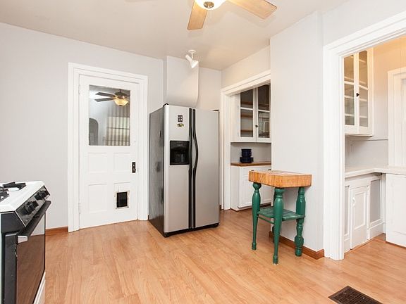 Late Victorian "Folk" farmhouse-style w sculpted clapboard, decorative brackets, more. It's pretty & it's BIG! Look out over the neighborhood from a nice open porch. There are FOUR bedrooms! HUGE main rm in the center of the house that you might use as a dining rm. A large living rm is at the front & features an angled bay window that looks east, The kit. has TWO pantries & room for a tab. A powder rm. laundry are immediately on hand. NEW high efficiency furnace. NEW tank-less water heater. Updated electrical panel box. Central air conditioning, too! The driveway is wide enough for two cars.