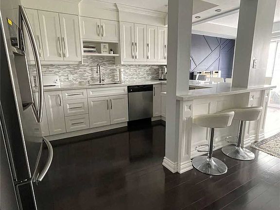 Modern Fully Renovated And Rare 3+1 Bdrms, 3.5 Baths Unit Townhome, Open Concept Kitchen W/Upgraded Appliances Incl. Glass Cooktop With Stainless Steel Hood, Breakfast Bar, Mosaic Glass Backsplash And Quartz Countertop. Functional Open Concept Living And Dining Featuring Electric Fireplace And Bar Cabinets. Led Lighting. Wood Flr On Main, W/Glass Railing Leading Up To 3 Spacious Bdrms And 2 Reno'd Baths. Main Flr W/O To Fully Fenced Yard Backing Future Park.