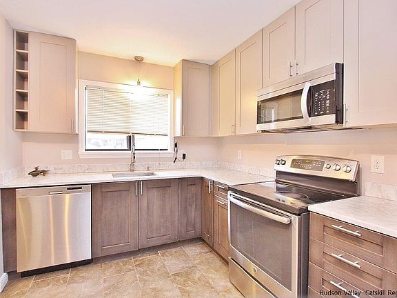 High end Townhouse located in the Rondout Harbor town-home complex. Completely renovated about 5 years ago this home features all custom two tone cabinets, marble counters and stainless appliances. The first floor also offers a dining room, half bath, large living room with high vaulted ceiling, wood burning fireplace, bamboo floors and sliders out to the back deck. Second floor has a a luxurious full bath with massive walk in shower, unique shell/stone tiles with granite accents. The bath also offers a marble counter with gold accents and and lavish sink fixture. Two massive bedrooms on this floor, master overlooking the old Kingston bridge. There is a pull down attic for storage. The basement has been fully finished, there is a utility room that houses the washer and dryer, also great for storage. The large open family room has acid stained concrete floors and walks out to a private back patio (could be used as 3rd bedroom). The end unit town-home is located a short walk to downtown Kingston (just over the bridge in the backyard), this unit does not have much of a water view although has a large back lawn area. Rondout Harbor community has an in-ground pool and pool house. Association fee is $355 a month and covers all garage, exterior maintenance, lawn and show removal right up to your front door.