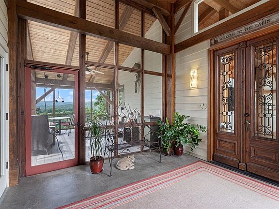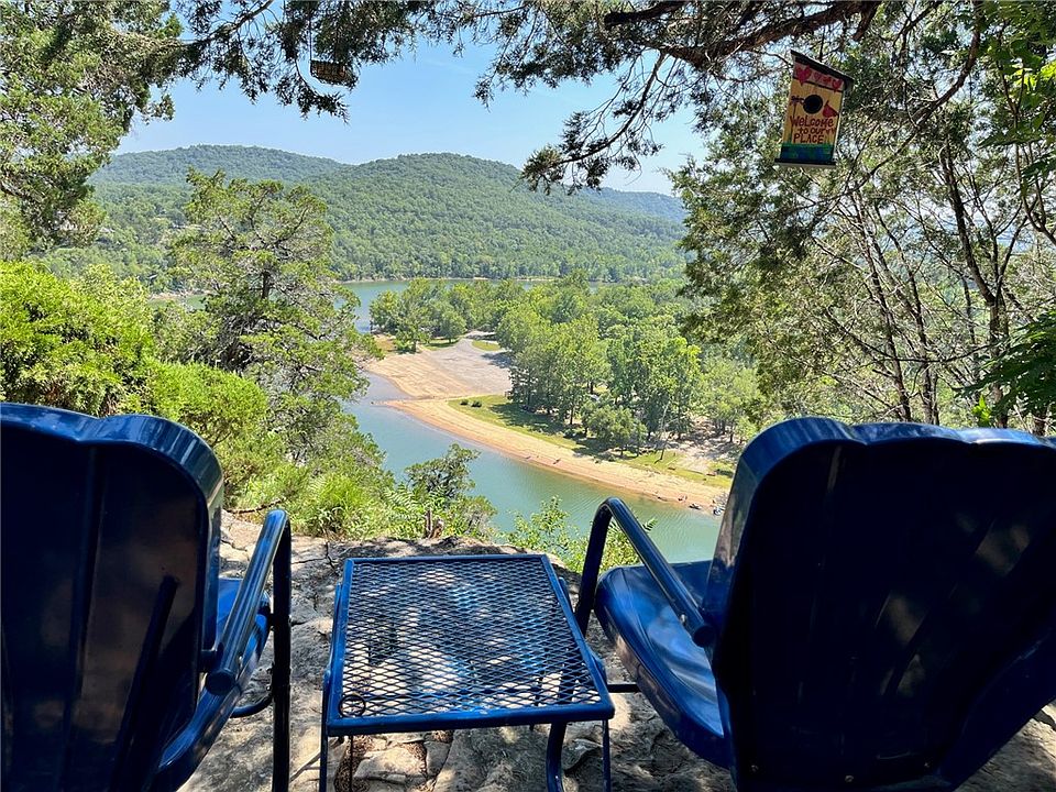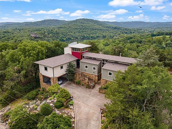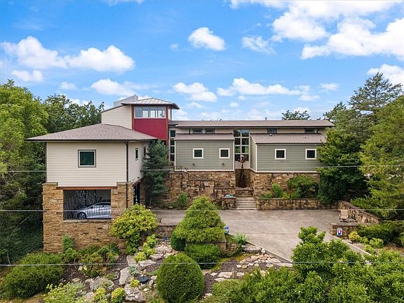 Perched above Tablerock Lake and designed to highlight the panoramic views, this stunning property offers contemporary architectural design and artisan finishes in every space. Inspired by the traditional Ozarks "dog trot" cabin, this modern version provides primary living quarters & separate guest space connected by the entry breezeway. The main portion of the home is true timber frame construction, built of pegged, hand-hewn hardwoods. The stylish interior is warmed by burnished wood, custom built-ins & eco-friendly bamboo flooring, highlighted by the window wall & expansive view. The guest wing includes kitchenette and 2 bedrooms with connected bath. The 3rd level perch offers a unique bonus room with more big views. Outdoors, enjoy beautiful rock gardens, or relax on the breezy screened porch, open deck or bluff-side patio. Additional special features include an elevator, whole house generator, basement level studio & storage. This home is more than just a beautiful place to live – it is truly a piece of art.