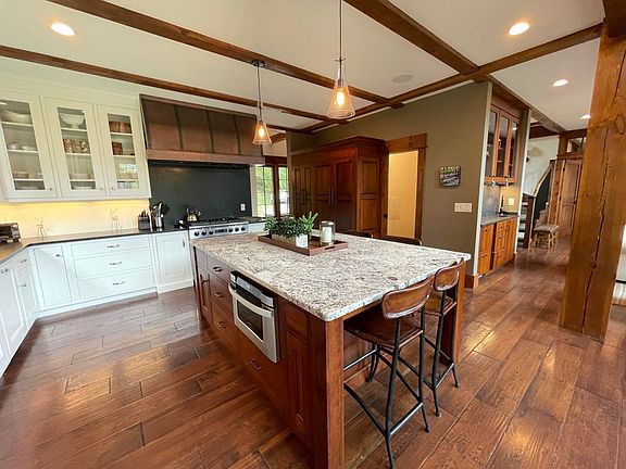 Beautiful luxury home located on the Sachem Trail of Okemo Mountain. A perfect combination of craftsmanship and mountain living, located in the coveted Snowbridge development. This home features 5 bedrooms, 4.5 bathrooms, and has an attached garage, (no more icy windshields!) To keep things organized, the house has a mudroom entry from the garage and a ski room right off the slopes. The living room has a vaulted ceiling with a stone fireplace and timber peg beams. Views from the living room show the home's prime location on the ski trail. Large windows and great lighting keep this home bright all year round. There is a gourmet kitchen open to the living/dining space, perfect for gatherings. The main level has a master suite with a bathroom, gas fireplace, and views of the slopes. Two suites round out the upper level. The lowest level has a bunk room, full bathroom, family room with a gas fireplace, and a large ski room. Enjoy the outdoor private hot tub overlooking the slopes to end a day of skiing. ROFR