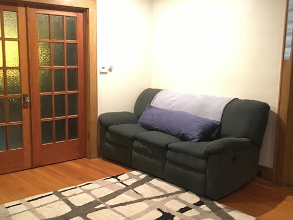 Complete first floor including beautiful screened-in porch, kitchen with gas stove, large bedroom, living room, small bedroom or office, and bathroom. Completely finished basement "common area" includes use of large room, storage unit and closet, laundry room with washer/dryer, and second bathroom. Also includes 2+ parking spaces in back lot and yard large enough to garden!