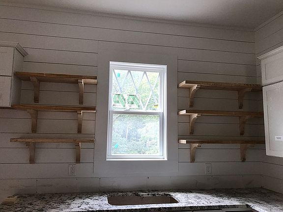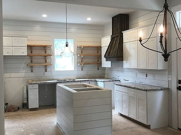 Gorgeous modern farmhouse with large front porch set on 1 Acre in a quiet swim/tennis neighborhood. Open floor plan with 10' ceilings on the main level, loaded with upgrades including solid pine hardwood flooring, tile baths, custom kitchen with open shelving and wood vent hood shroud, upgraded lighting, custom vanities and island top by European Pine, shiplap walls, custom built-in mudroom area, huge master suite, sodded yard with mature trees and irrigation system, dual split driveways, and basement area stubbed with plumbing for future bath. Added and 20x30 shop/garage with A/C and heat pump. Fence around entire backyard.