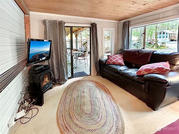 This setup can't be beat! The cozy trailer with add-a-room is set far back on the lot, giving you plenty of outdoor space. Whether you want to add a shed and/or gazebo, or maybe host more guests in a visiting RV, there's room. Inside sleeps 8 guests between the bedroom, bunk room and the addition which has a futon bunk bed. Bring everyone! There's a covered deck for dreary days and a paver patio around the fire pit for songs, stories and s'mores. A dine in kitchen and full bathroom, too. It's got everything you need to start making memories. Community amenities include two pools, parks, playgrounds, disc golf, tennis, Nooksack River access, 24/7 security and more. Limited to 120 days/year occupancy. No rentals.