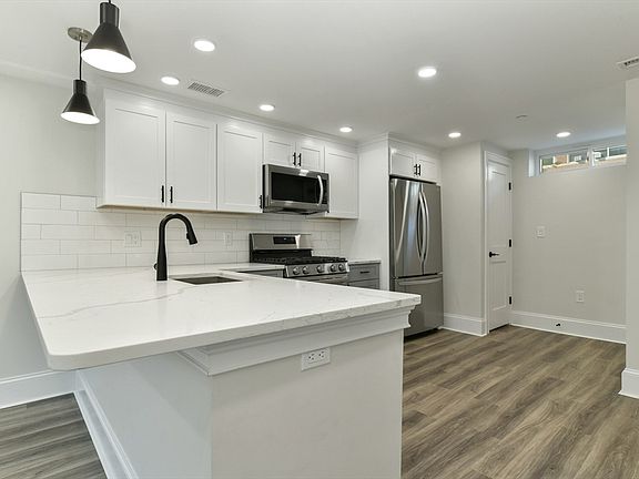 Eagle Hill bi-level 2 bed, 2 bath set in a charming mansard end house! The 1st level features a bright open floor plan with walkout private yard, ample dining space, 1 full bath, and full size Samsung washer & dryer. An eat-in kitchen is highlighted by 2-tone shaker cabinetry, Calacatta quartz countertop, 4-seat dining peninsula & LG appliance package with gas range and fully vented microwave. The 2nd level includes two large bedrooms with spacious closets and one full bath. Each full bath includes a walk-in shower with GROHE handheld shower system, Calacatta porcelain tile, marble herringbone shower flooring & Calacatta quartz vanity tops. Additional features include solid oak hardwood flooring, Central HVAC, Ecobee Smart Thermostat, Navien tankless water heater, Cat 6/cable outlets, keyless entry and pet-friendly yard area. Walk to Airport Station on the Blue Line, groceries, restaurants, fitness, parks, and much more from this convenient Eagle Hill location!