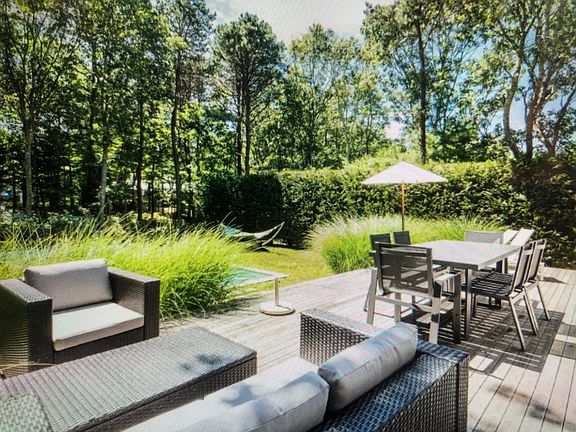 Rental Registration #: 25-32 This home is located between East Hampton and Sag Harbor villages. The house has an open plan layout with several windows overlooking the large pool and landscaped garden. On the ground floor, there is a bedroom with two twin beds that can be combined into a king. The en suite bathroom has a large walk-in shower.Upstairs there are two bedroomsone with a queen and king-sized beds. The bedrooms share a large connecting bathroom with a walk-in shower and soaking tub to luxuriate in. Both bedrooms have private terraces, including one with views of the backyard pool.The basement is finished and equipped with an entertainment area and foosball tableideal for extra enjoyment and a perfect retreat for kids and a gym area with exercise bike and free weights.Outside the deck has a separate lounge and dining area, a hammock, and a large heated pool creating a perfect retreat in the Hamptons and an ideal escape from the city. Other house features include dual-zone air conditioning, gas stove,dishwasher, heated pool, indoor gym, outdoor shower & gas BBQ, and more.