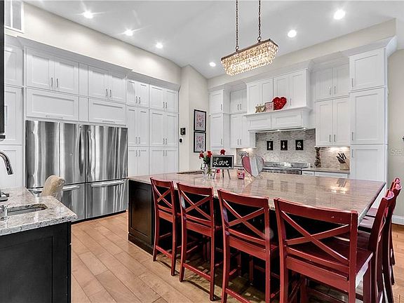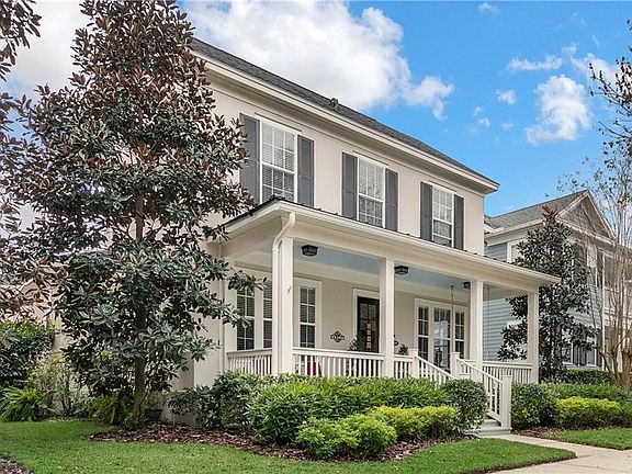 Welcome home to this beautiful Morrison Chelsea Coastal home across from Deer Woods Park in East Village. This property was meticulously designed with high-end finishes throughout, including granite counters in kitchen and extra large island that seats 7. The kitchen features beautiful cabinetry with plenty of storage, a 6 burner gas range with griddle, double oven, microwave, double refrigerator, wet bar and stainless steel sink overlooking the family room. The home offers wood floors throughout the first floor with tile in the bathrooms. The large kitchen/family room combination offers a large space for entertaining with a cozy fireplace. The master bedroom is located on the first floor with beautiful wood flooring, a tray ceiling and spa-like master bath. You will also find a Theater Room complete with full bath separated by a unique set of barn doors on the first floor. Upstairs you will find 3 additional bedrooms and 2 full bathrooms. In addition to the spacious interior of the main home, the property features a one bedroom apartment over the 3 car + garage complete with area for a dinette and charming living room. To top it off head outdoors where you will find a wonderful brand new wood deck with an automated roof covered pergola covering the equivalent of a second entire gathering area outdoors that also includes a completely automated privacy screen. Don't miss the opportunity to see this beautiful home that has it all! Located in quaint East Village, the home is near the East Village community pool and is close to walking trails that will take you to downtown Celebration filled with charming shops and restaurants.