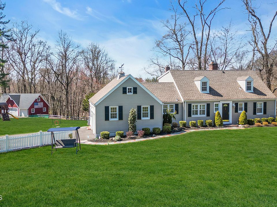 Stunning, updated Country Chic Cape on 2.5 private acres with its own pond—nestled in one of NJ's most sought-after towns with top-rated Holmdel schools. Featuring 4 bedrooms, 2 full baths, hardwood floors, crown molding, and sun-filled living spaces throughout. The living room offers a wood-burning fireplace and built-ins, flowing into a dining room with detailed millwork. Vaulted gourmet kitchen with granite, stainless appliances, and banquette seating. First-floor primary en-suite, sunroom/mudroom, and attached garage. Finished walk-out basement. Detached 4-car barn-style garage, Tesla charger,Whole house generator,10 years young oversized septic, and serene pond complete this dream property—minutes to Bell Works, NYC transit, parks, and beaches. It is truly all that Monmouth County has to offer not to mention it is located in one of the top rated school districts in New Jersey. Located near major NYC transposition, fine dining & shopping.