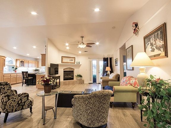 It's Like A Vacation Every Day, relaxing by the custom inground pool on a gorgeous back patio, taking in the views! This delightful, upgraded home offers 3 bedrooms and 1.75 baths with an open & bright floor plan. The spacious island kitchen has ample cabinet & counter space, a comfortable dining area with access to a private patio, and opens into the large great room with vaulted ceilings and a cozy fireplace. The roomy master suite has dual vanities, updated walk-in shower and a walk-in closet with custom door that's a bookcase! The master suite has easy access to the back patio and pool, which utilizes solar heating for more days of enjoyment, plus a powered security cover. Other amenities include an indoor laundry room with storage & built in sink, attached 2 car garage, 2 outdoor sheds for extra storage, and tons of concrete for added parking & ease of maintenance. This rare find could be exactly what you've been looking for.....the ideal stay-cation!