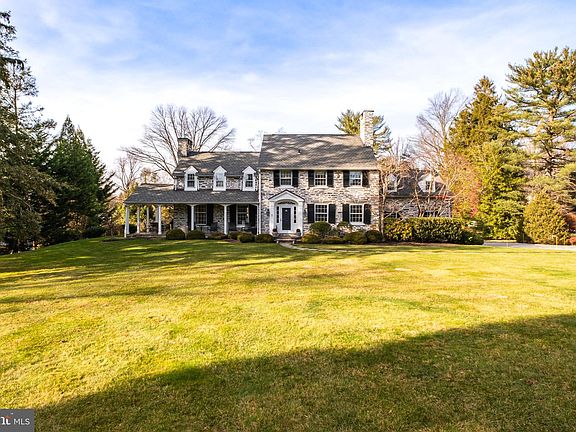 Commanding a premier position on one of the Main Line’s most storied streets, this Stone Colonial reflects the architecture, setting, and heritage that define Gladwyne at its finest. Set on expansive, level grounds of 1+ acre encompassing two separately deeded lots, the home offers classic stonework, mature trees, and a sense of provenance that sets it apart. With decades of careful stewardship by one family, the home carries a legacy of pride and care, having accommodated changing needs while preserving the elegance at its core. Inside, sunlight moves through well-proportioned rooms, highlighting traditional millwork and creating a welcoming flow suited to everyday life. A gracious foyer provides sightlines to the principal rooms and a natural place for guests to gather. A sweeping staircase traces the curve of a graceful wall, creating an architectural centerpiece that enhances the home’s classical design. Anchored by a fireplace, the living room invites relaxed evenings and conversation, and includes a glass-paneled door opening directly onto the covered porch. Long the setting for family meals and holidays, the dining room features a custom china cabinet. The covered porch and adjacent flagstone patio extend living outdoors for morning coffee, dinners under cover, and play across the grounds. The kitchen offers ample counter space, a center island with counter seating, multiple work zones, and skylights that brighten the room throughout the day. The home’s original exterior stone wall—now exposed within the kitchen, breakfast room, and mudroom—adds natural texture and anchors these spaces with the home’s original character. In the adjoining breakfast room addition, enhanced by added light and space, a large bay window frames sweeping views of the rear grounds, making each meal feel connected to the outdoors. Just beyond, a comfortable family room becomes the home’s informal heart, with warm natural light, abundant windows, and custom cabinetry—an ideal spot for reading, casual gatherings, or unwinding at the end of the day. This room also features a set of glass-paneled French doors opening to the flagstone patio. A powder room sits nearby. Along the side, a window-lined family entrance leads to a mudroom with inside access to the garage. Upstairs, the primary suite serves as a serene retreat with windows on three exposures, a dressing area with built-in cabinetry, and a private bath with both tub and shower. Additional bedrooms continue the home’s classic character and enjoy convenient access to baths on this level. A walk-up attic offers finishable space and easy-access storage, presenting future potential while remaining functional today. On the lower level, a finished recreation room features recessed lighting, a drywall ceiling, custom cabinets and bookcases, closet storage, and a stone-surround fireplace. In the adjacent unfinished area, abundant storage accompanies the laundry and mechanicals; the laundry includes a stainless utility sink. Outside, the expansive grounds, mature trees, and a garden area outlined by knee-height stone walls with a small fish pond create a peaceful landscape that naturally becomes a playground for children and a backdrop for outdoor life in every season. A whole-house generator adds peace of mind. Homes offering this level of character, acreage, and long-held architectural lineage rarely come to market.