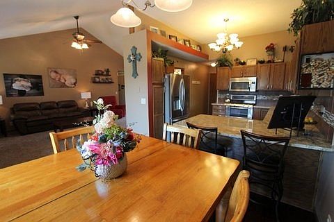 You won't want to miss seeing this beautiful 4BD, 3BA move-in ready home! The kitchen has been updated w/granite countertops, stainless steel appliances and wood flooring that extends to the dining area. The living room has a built-in fireplace, vaulted ceiling and ceiling fan. The main floor master bedroom has an en-suite bathroom w/two sinks and a granite countertop, walk-in closet and a separate tub and shower. The two other main floor bedrooms share a guest bathroom featuring a granite countertop and a tub/shower combo. The walk-out, view-out basement has a large family/rec room, area for a bar, bedroom, bathroom and storage room. In the fenced back yard, you can enjoy time on the upper deck or the shaded patio area underneath. (Playset is negotiable)