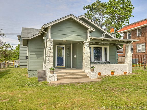 TONS OF CHARM! Darling 1920s bungalow in the heart of Sand Springs’ thriving historic district! Gracious front porch – perfect for morning coffee or wrapping up a long day! – opens to a beautiful entry with wood floors, lovely natural light & storage. Large living room with coffered ceilings and gorgeous mantle-encased wood burning stove opens to a sizable dining room – perfect for entertaining! Sunny, spacious kitchen features tons of wood cabinets, extensive tile counters, gas range and breakfast bar. Outstanding light-filled utility/mudroom has lots of storage. Primary bedroom down with quick access to lovely, updated hall bathroom with pretty tile shower/tub combo and storage! Second bedroom down has a huge closet. Upper level of the home features two bedrooms, a full bath with shower/tub combo, a living area and TONS of storage – could function as a separate “apartment” or large mother-in-law unit. Oversized TWO CAR GARAGE off alley has plenty of room for work space or hobbies, plus equipment storage! Updated, zoned Trane HVAC. New exterior paint! Walk to Box District for dinner, shopping & farmers’ market! Quick access to highways, just 15-minutes from Downtown Tulsa.