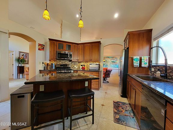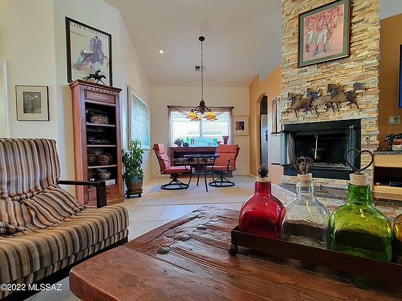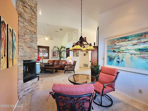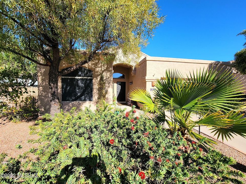 Open Today 2-5 April 7th !! Beautiful Split bedroom floor plan with Custom upgrades throughout. Granite Counters, Custom Cabinets, Tile floors, Gas Fireplace, Owners bath with Loads of Luxury and big Walk in Closet. Den could be used as 3rd bedroom. Very lush yard with covered patio and pad for hot tub. Fish pond fountain. Low maintenance.Solar on roof is through TEP Residential Solar to ensure budgeted payments