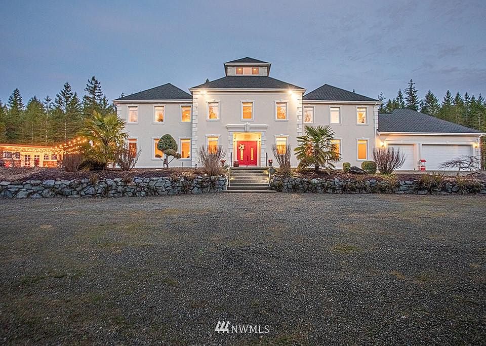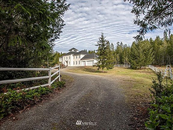 Reminiscent of a European country estate complete with an observatory tower that captures a 360 degree view, combined w/privacy & covering 22 acres that borders Tahuya State Forest. The residence offers elegance combined w/comfort at every turn. This 3968 sqft home boasts gorgeous chefs kitchen, spacious main floor luxury master suite, main level office nook, 3 Ensuite bedrooms upstairs, huge game room/home theater with FP & kitchenette. Finishes include elegant crown moulding, gleaming tile floors, solar panels, radiant heat throughout not just home, but the 3 car garage & shop. The estate offers a pool house with an endless pool & attached bath, 5,000 sqft shop, which includes an ADU w/full bath, kitchen, laundry, & racquet ball court.
