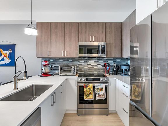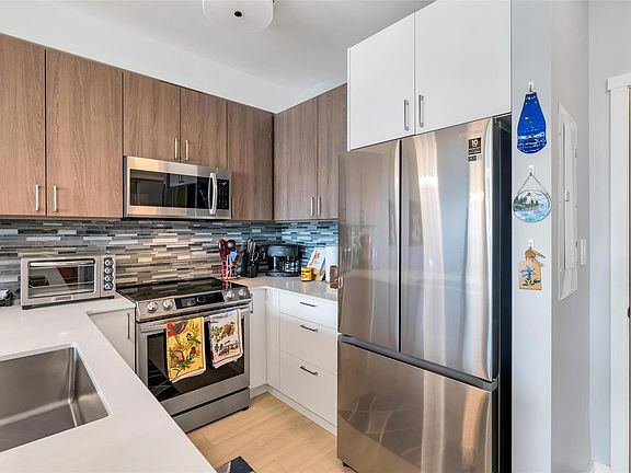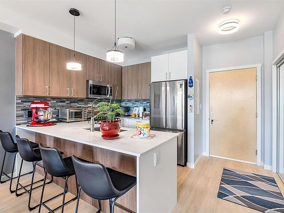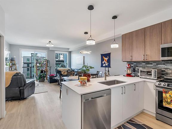 Bright and beautiful 2 bed, 2 bath condo in Pacific Trilogy Two—a modern 6-storey building in the heart of downtown Langford. This like new home features a functional open-concept layout with 9-ft ceilings, a chef’s kitchen with quartz countertops and stainless appliances, and spacious living/dining areas with an electric fireplace and access to a sunny balcony—perfect for your morning coffee. The primary bedroom includes a 3-piece ensuite with built-in closet organizers. Comfort is ensured year-round with an efficient heat pump offering heating and air conditioning. Additional owner upgrades include heated tile floors in both bathrooms, custom Murphy bed, fresh paint, updated tile work, Lutron smart switches, and new LED lighting. Secure parking included with E/V rough in. This award-winning, pet-friendly building also offers a fitness centre, bike storage, and a 91 Walk Score -just minutes to shopping, restaurants, parks, and recreation. Vacant and available for immediate possession.