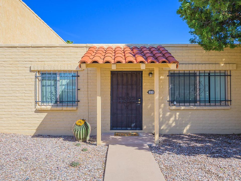 This GREAT VALUE is move-in ready for you or your tenants! Clean & lovely single-level, ground-floor condo features 2 bedroom/2bathroom split floor plan, updated bathrooms, fresh paint, newer windows, newer AC, custom closets & your covered parking space directly in front of your door! Updated kitchen has plenty of cabinets, counterspace, spacious dining area with built-in desk & direct access to your private/enclosed back patio with roses. Unit has STORAGE galore plus washer/dryer in unit. This is a nice community with well maintained common area - close to bus lines, DM AFB, shopping, dining & schools. HOA covers: Water, Pool, Landscaping, Exterior Building Maintenance & Roof. Hard to beat at this price!