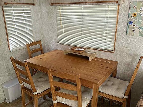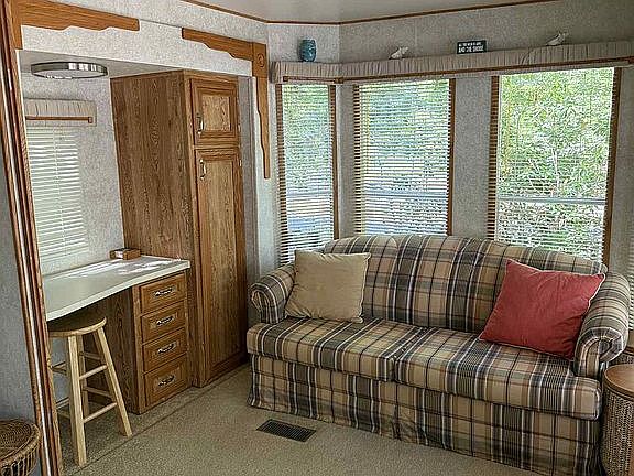 Site 100 features a 2002 Breckenridge Park Model with a deck. This unit has one full bathroom and one bedroom with a full-size bed, as well as two queen bed sofa pullouts. The living room area and desk area opens to a full kitchen with a stovetop oven, refrigerator, and a dining area. The unit is serviced with roof air conditioning as well. Located on a landscaped site, there are two sheds included and plenty of outdoor space for entertainment.