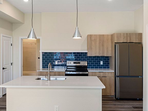 Unique backsplash colorsCreative finishesDowntown garagesDesigner pendant lightsLarge kitchen islandsPrivate attached garage optionsModern floorplan